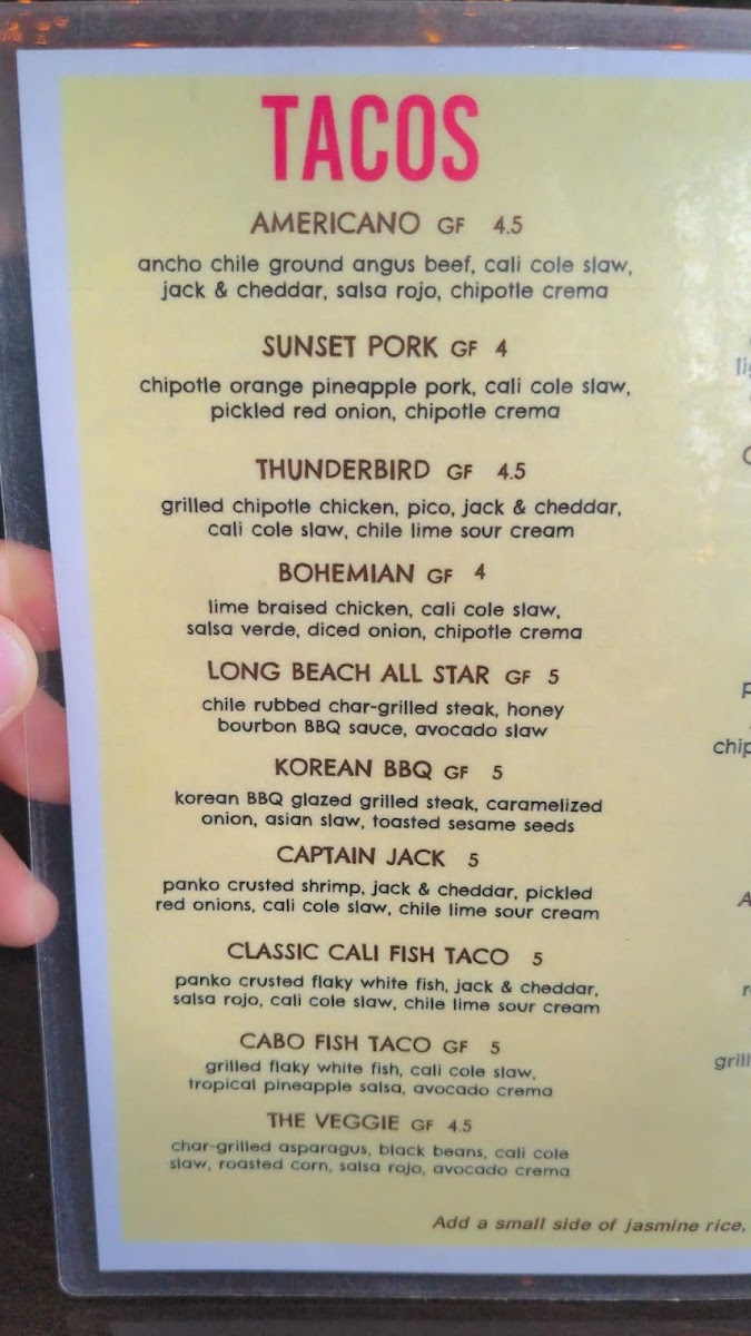 Gluten free. Jasmine rice, avocado, black beans, pico, Cali coleslaw and avocado crema. Served with homemade corn tortilla. Gluten Free.