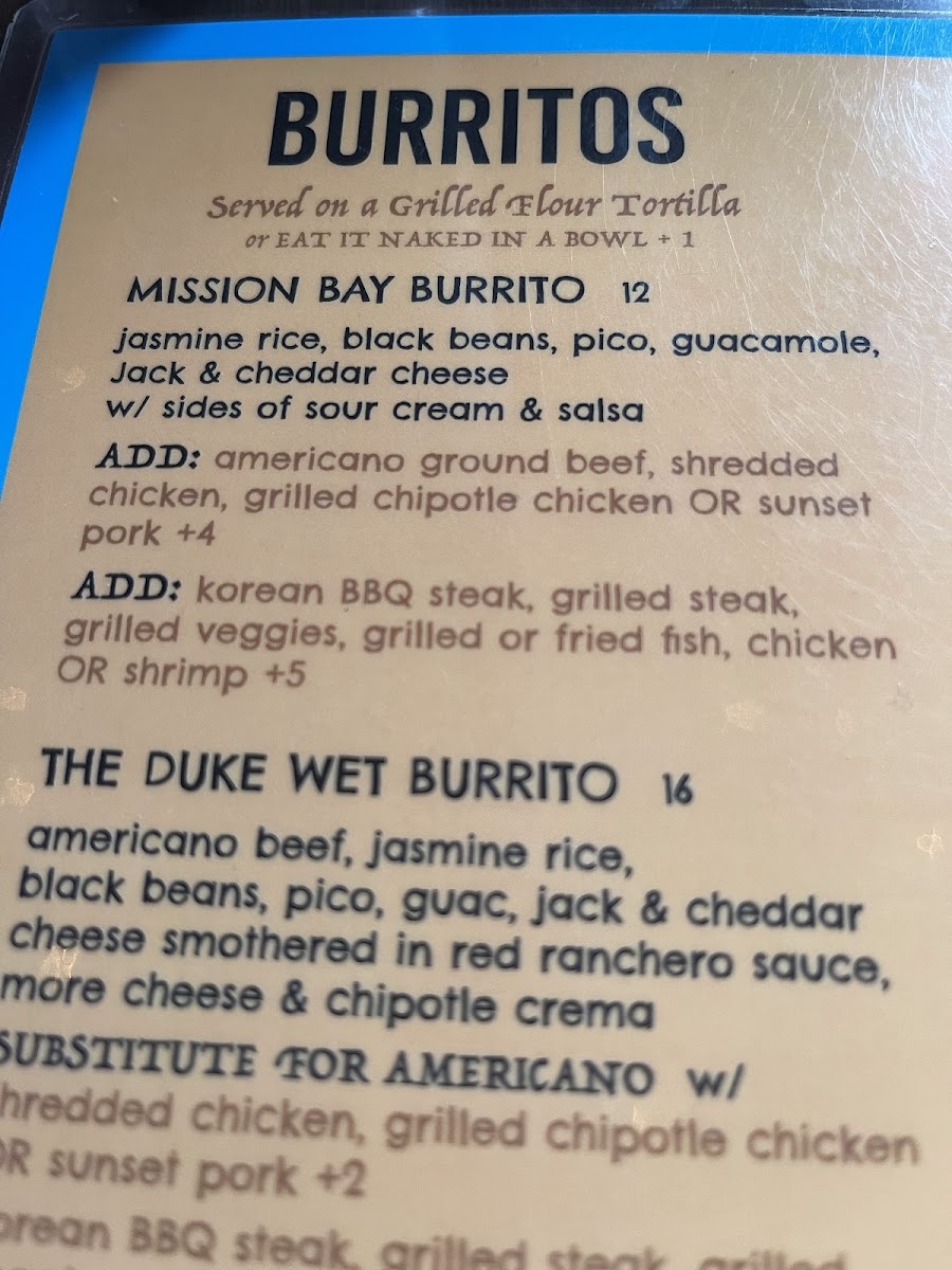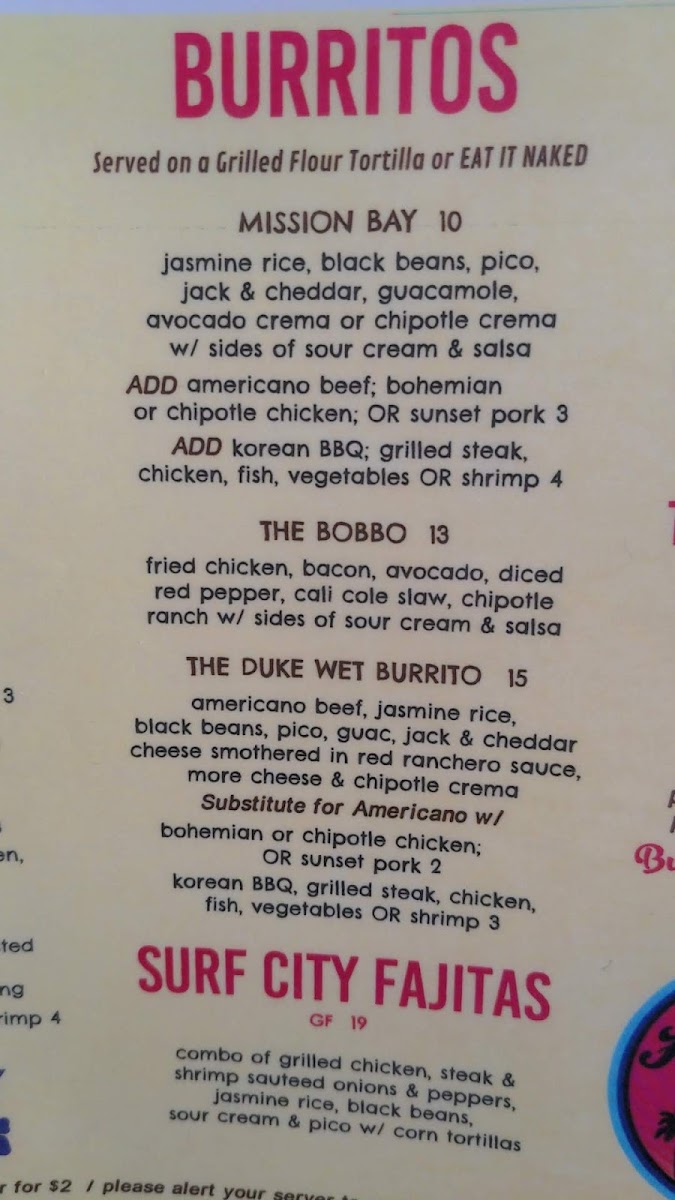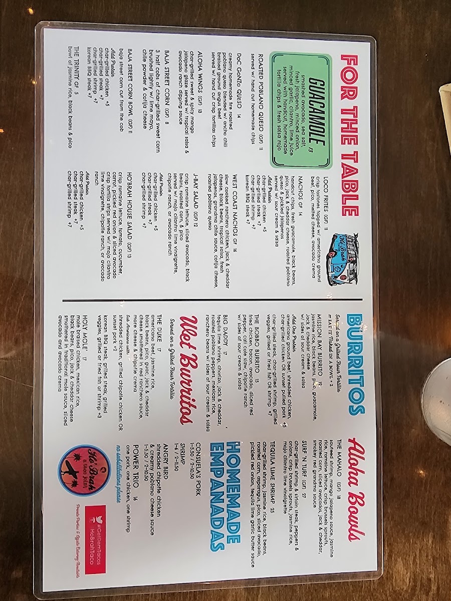 Starting with their Burritos, Ho'brah presents some exciting choices, including the Sunset Surfer Burrito and Mission Bay Burrito, both loaded with fresh ingredients. The Bobbo Burrito and The Duke Wet Burrito take things up a notch for those looking for something hearty, while the Holy Mole Burrito adds a rich, mole sauce twist to the classic dish.