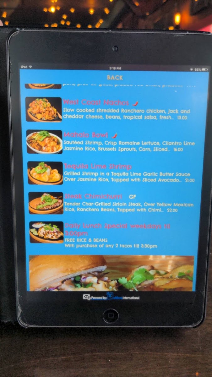 Tequila lime shrimp, jasmine rice, pico and Cali coleslaw. Served with homemade corn tortilla.